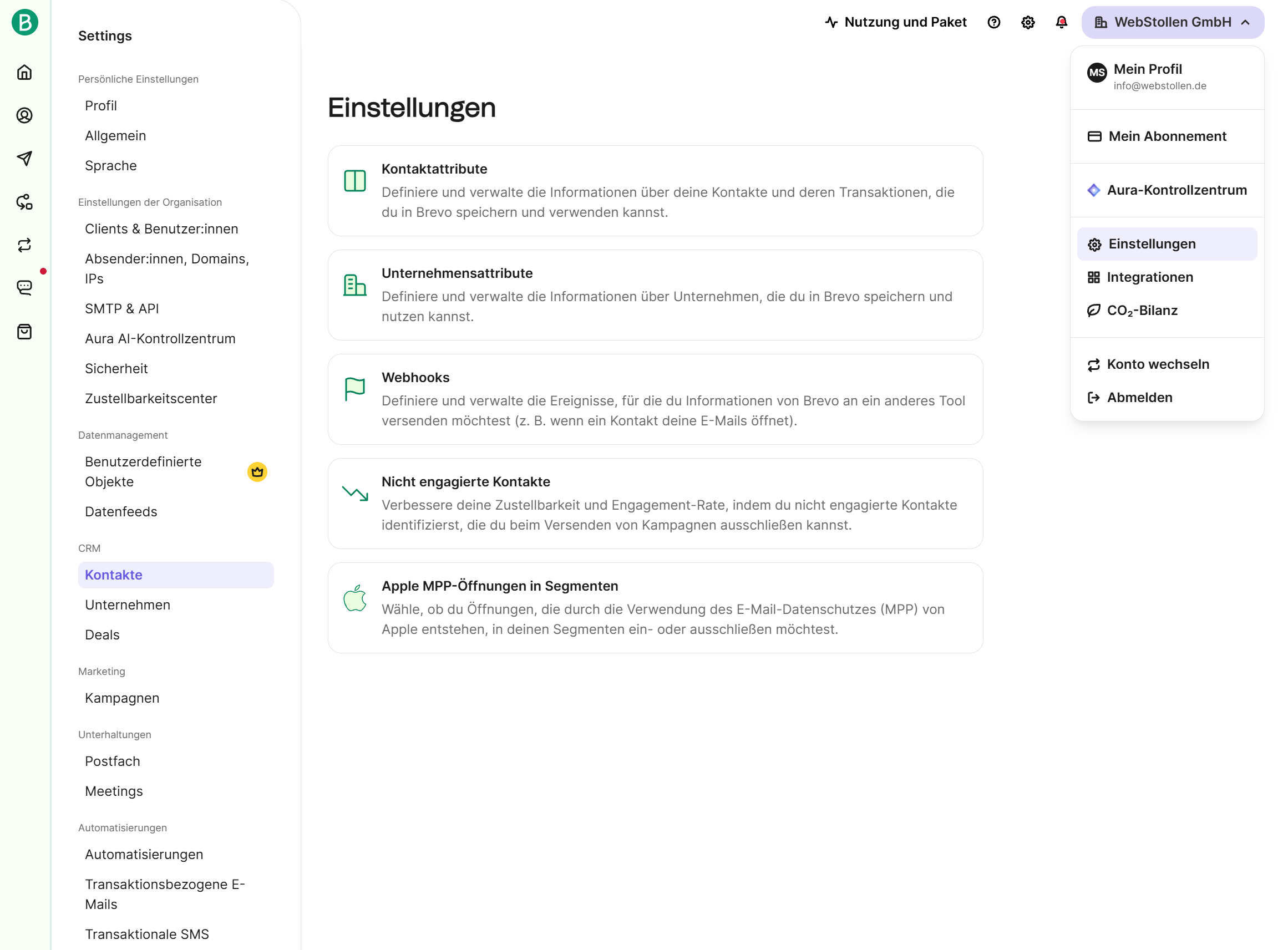 In der unten aufgeführten Liste, findest du alle Attribute mit Namen, Beschreibung und Typ. Diese Attribute musst du bei Brevo bei den Kontaktattributen anlegen. Die Kontaktattribute findest du unter deinem Brevo-Profil (Dropdown-Menü oben rechts) > Einstellungen; dann links im Menü CRM > Kontakte > Kontaktattribute und unter diesem Link.