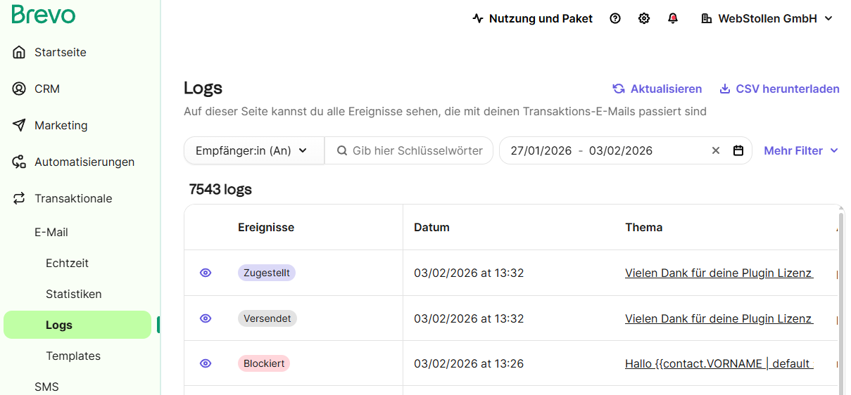Du kannst alle E-Mails aus dem Shop (z.B. Bestellbestätigung & Co) über Brevo laufen lassen. So siehst du bei jeder Mail: