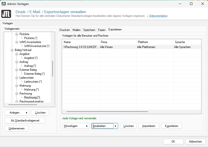 Öffne deine JTL-Wawi und klicke unter Admin → Vorlagen: Druck- / E-Mail- / Exportvorlagen auf den Knoten „Rechnung“.