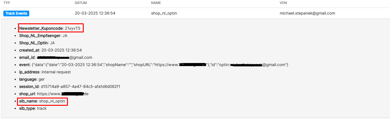 Der Couponcode wird mit dem Event (shop_nl_optin) an Brevo übertragen. Eine Liste aller Events kannst du in folgendem Artikel nachlesen: Automation & Event-Tracking