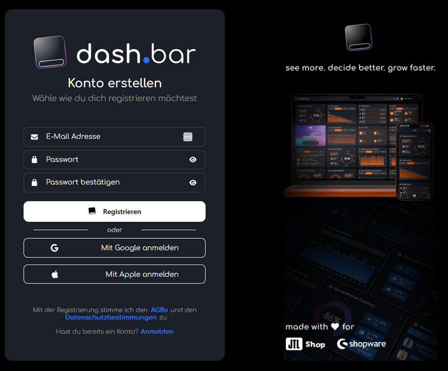 Du kannst jederzeit jemanden in deinen dash.bar Account einladen. Dieser hat dann ebenfalls Zugriff auf Dashboard & Co.