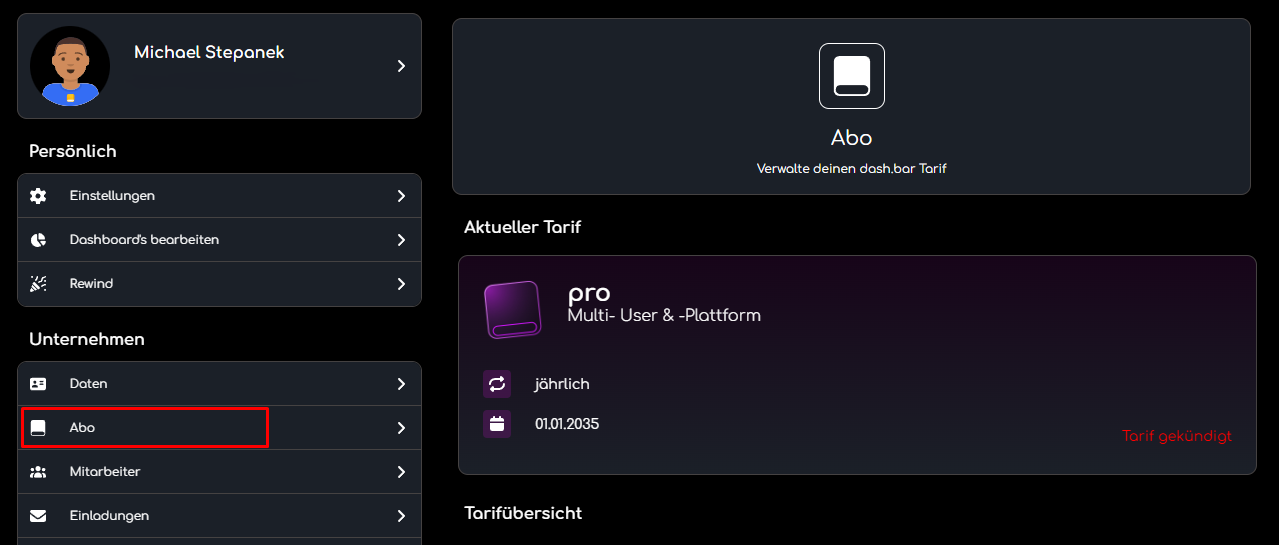 Rechts findest du deinen aktuellen Tarif und kannst diesen per Klick kündigen.