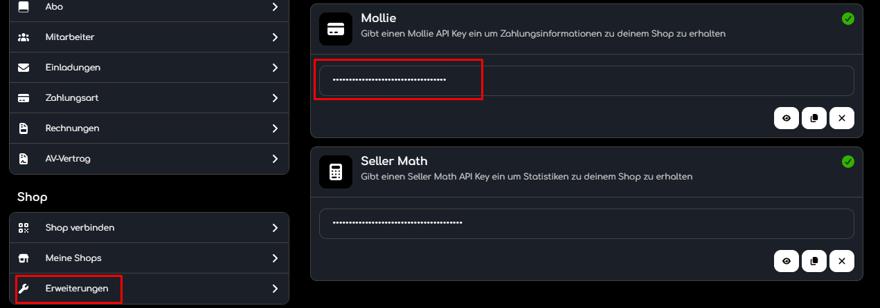 Dazu gibst du nur deinen mollie API Key ein (unter "Erweiterungen") und legts das Widget auf eines deiner Dashboards.