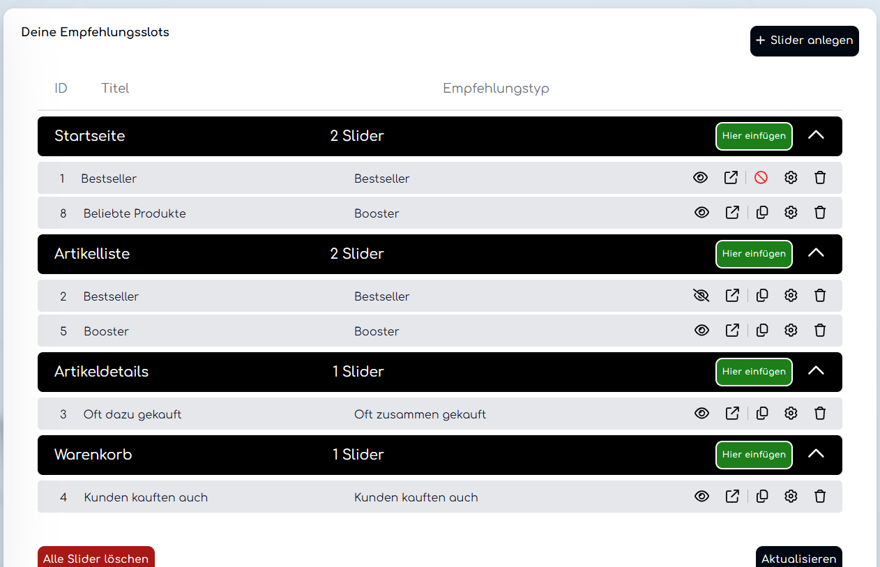 Um einen neuen Empfehlungs-Slot zu erstellen, musst du zunächst in den Tab "Empfehlungen" wechseln. In der oberen rechten Ecke befindet sich dort der Button "Slider anlegen", über den der Assistent für die Erstellung einer neuen Empfehlungen geöffnet werden kann. In der folgenden Anleitung wird Schritt für Schritt erklärt, wie ein neuer Slot angelegt wird und welche Auswahlmöglichkeiten es dabei gibt:
