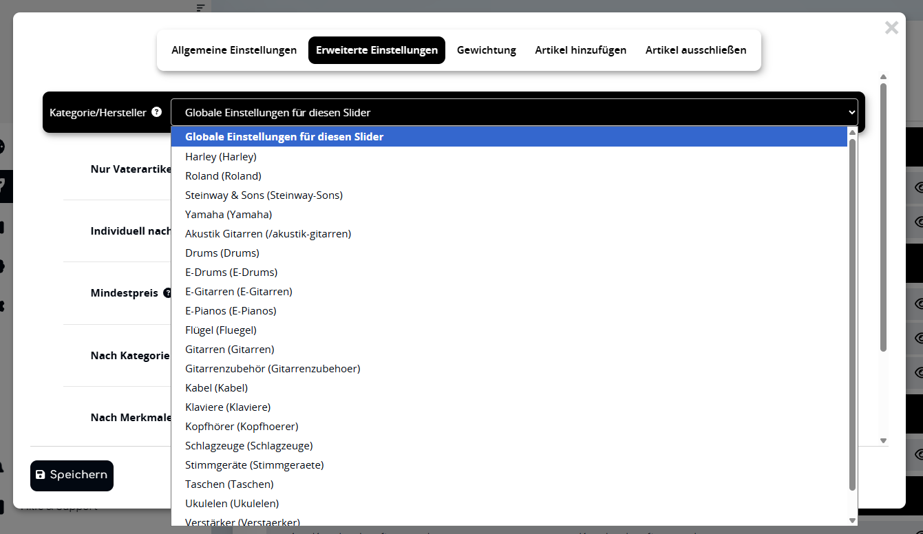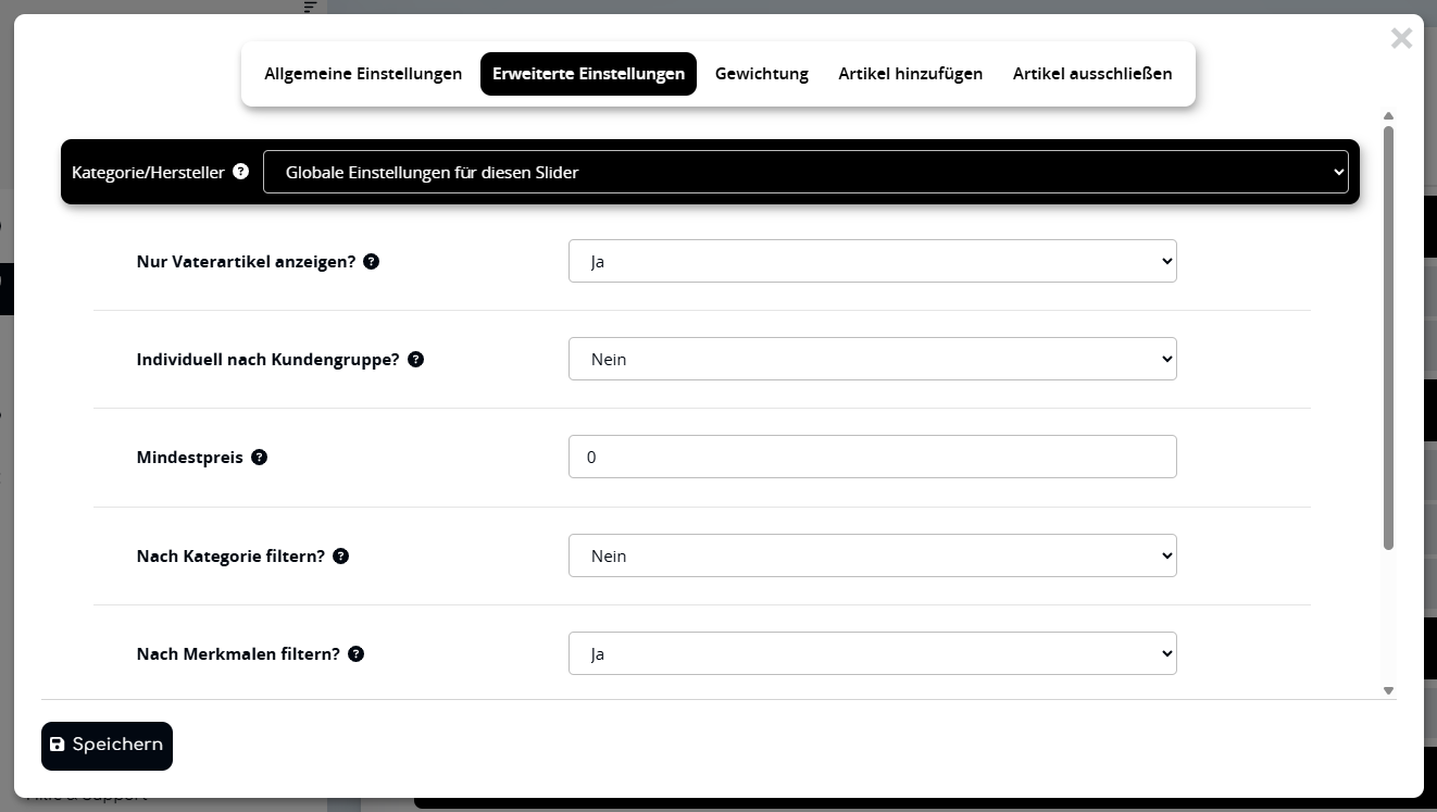 Ist der Slider in der Kategorie "Artikelliste", kannst du auch Kategorie- und Hersteller-spezifische Einstellungen vornehmen. Diese gelten dann nur auf der passenden Seite.