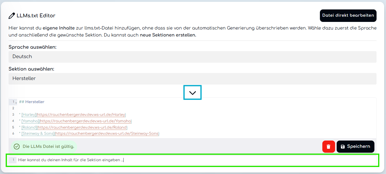Hier kannst du die llms.txt-Datei direkt im Texteditor bearbeiten. Deine Änderungen werden aber erst übernommen, wenn du sie speicherst.