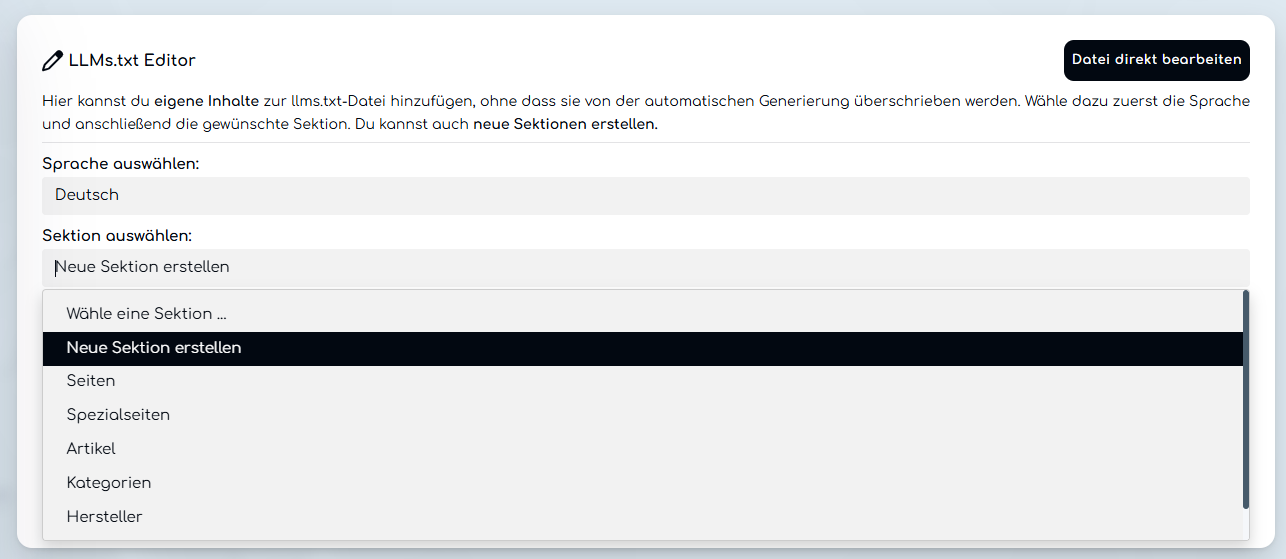 Die Texte stehen dann jeweils am Anfang der passenden Sprachsektion in der llms.txt. Du kannst dieser aber auch jederzeit wieder in dem Sprachtexte-Tab bearbeiten.