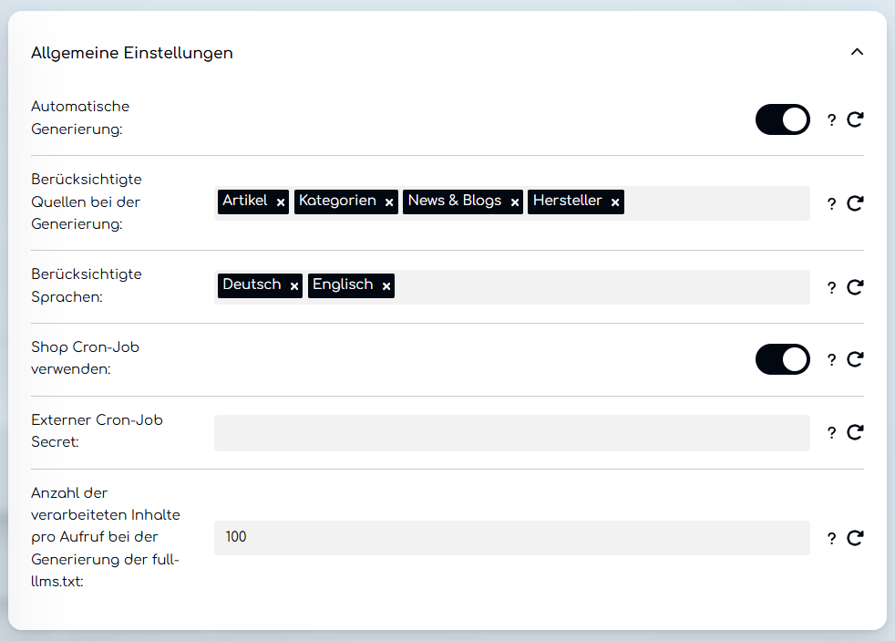 Anzahl der verarbeiteten Inhalte pro Aufruf bei der Generierung der full-llms.txt: Wie viele Zeilen an Daten/Datenbank-Einträgen sollen pro Cron-Job-Aufruf bei der Generierung der full-llms.txt verarbeitet werden? (Je höher die Zahl, desto schneller die Generierung, aber auch höhere Serverlast)