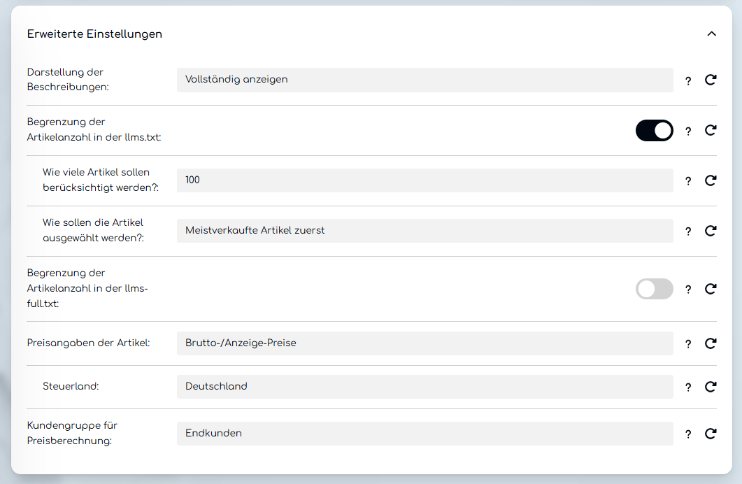 Nicht verfügbare Artikel ausschließen: Ist das aktiviert, werden nicht lieferbare Artikel nicht mit in die llms.txt mit aufgenommen.