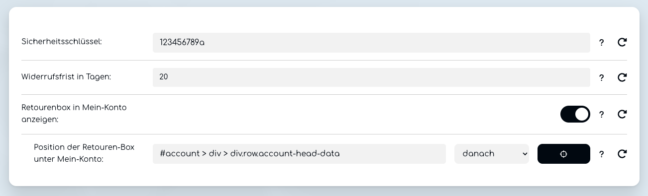 - Retourenbox in Mein-Konto: Über diese Einstellung kannst du entscheiden ob, und wenn ja wo, ein Hinweis auf das Retourenformular unter "Mein Konto" angezeigt werden soll