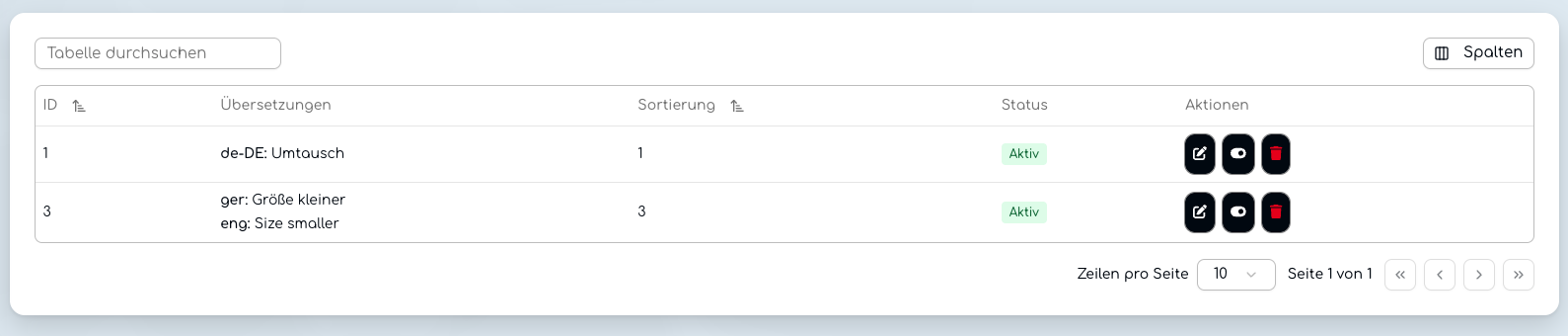 Im Pluginbackend besteht die Möglichkeit die im Formular vorhandenen Aktionen für jede Sprache zu definieren. Diese Aktionen kann der Kunde dann auswählen und werden dir in der angelegten Retoure in der Wawi entsprechend angezeigt.