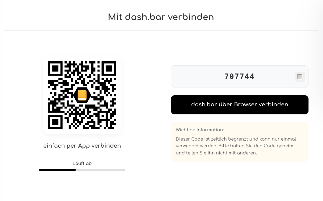 - oder kopiere den Code und klicke auf „dash.bar über den Browser verbinden“.