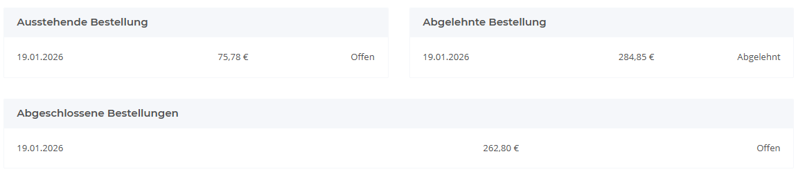 Ein Mitglied kann nur sehen, wann er eine Bestellung abgegeben hat, wie viel der Warenkorb Wert ist und den Status der Bestellung.
